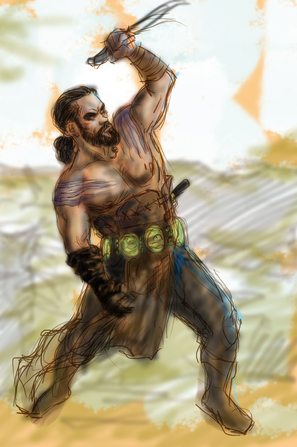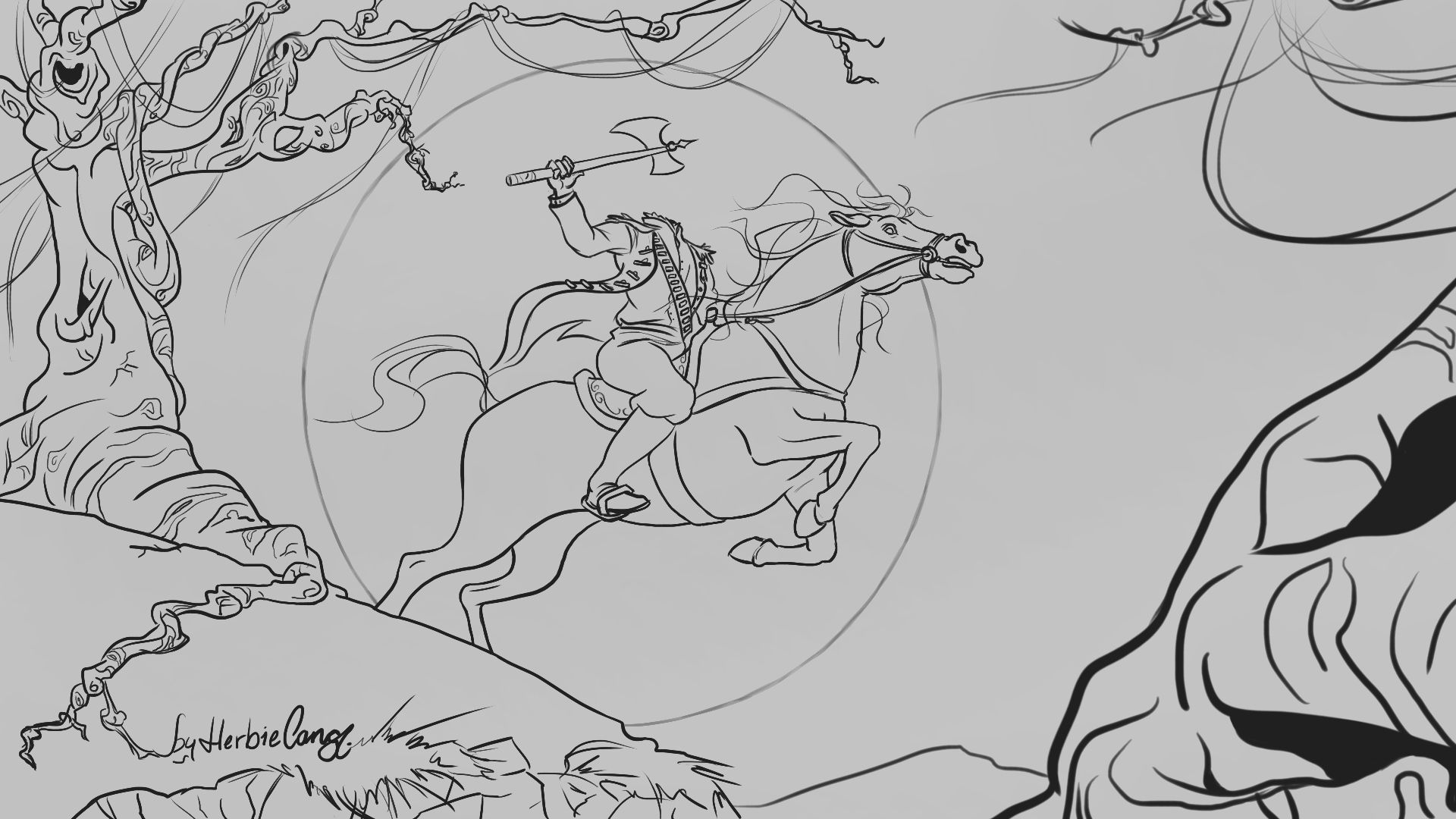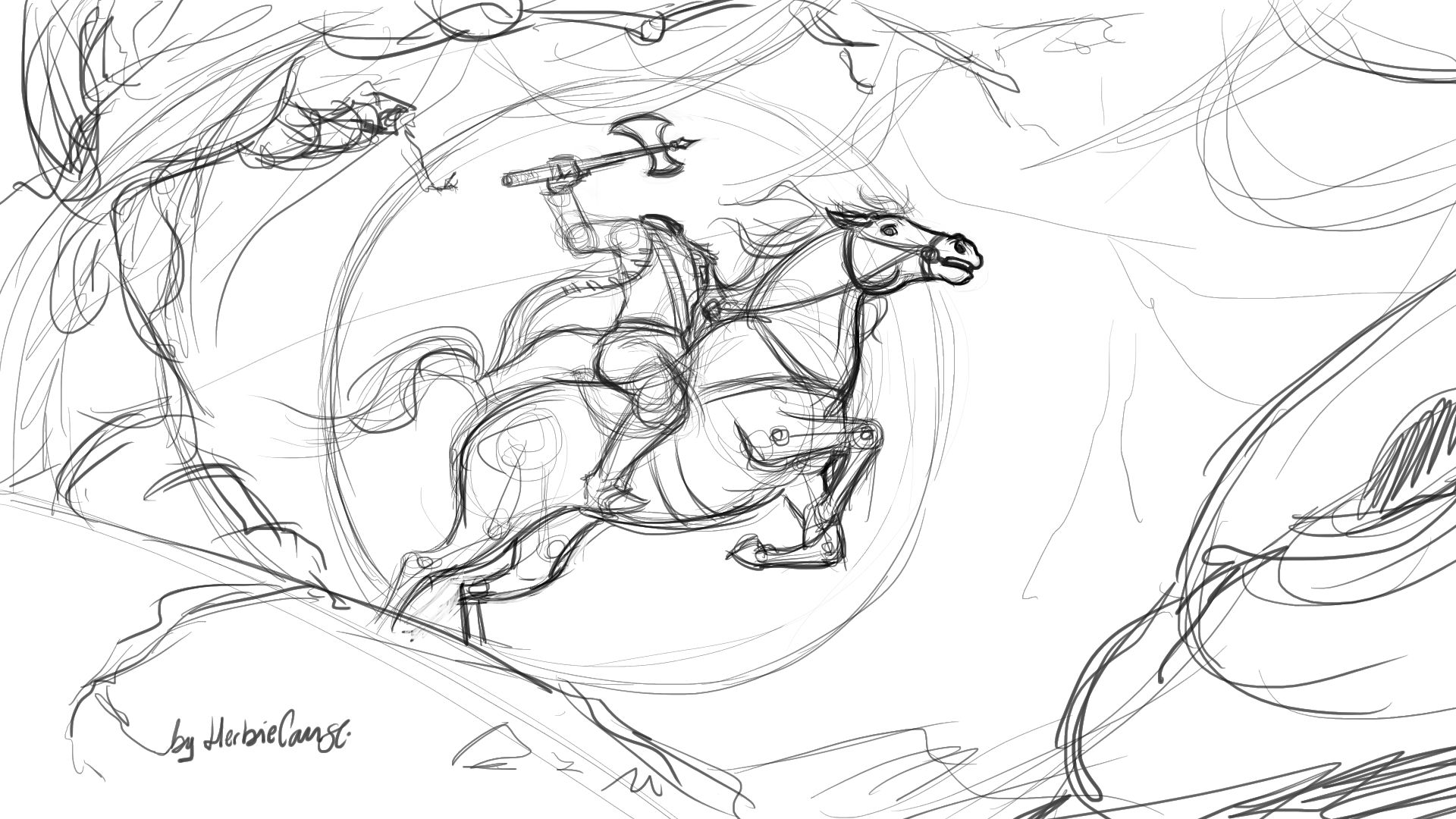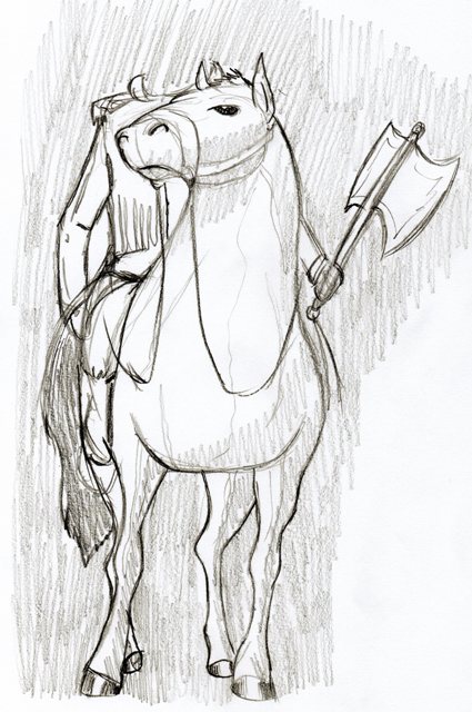 OH. Kouprey Me ENCANTA, y mira qué los escorzos suelen ser chungos por aquello de que la silueta es complicada de leer, pero oye, me encanta este boceto, sobre todo la cara del caballo. Esta genial. Tiene papeletas para ser una buena pieza. Quizás, la mano que sostiene el hacha, si la mueves hacia arriba y cambias el ángulo del brazo, que esté más flexiónado, podría dar más peso al hacha. ¿Qué te parece?