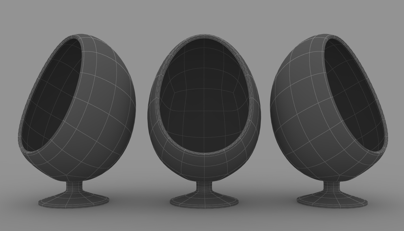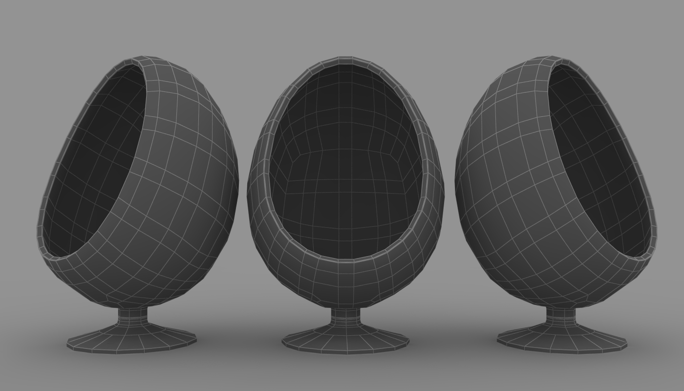 Intento modelar para mobiliario del juego (intento ambientarlo en el modernismo y posmodernismo de finales de los 60/ principios de los 70) muebles de diseño característicos. Y como sabía que era el que más problemas me iba a dar, he comenzado por ovalia, la silla huevo diseñada por Thor larsen en 1968: http://www.ovalia.com/eng_ovalia.htm <- Esta de aquí, no confundir con la silla totalmente redonda, que también hay.