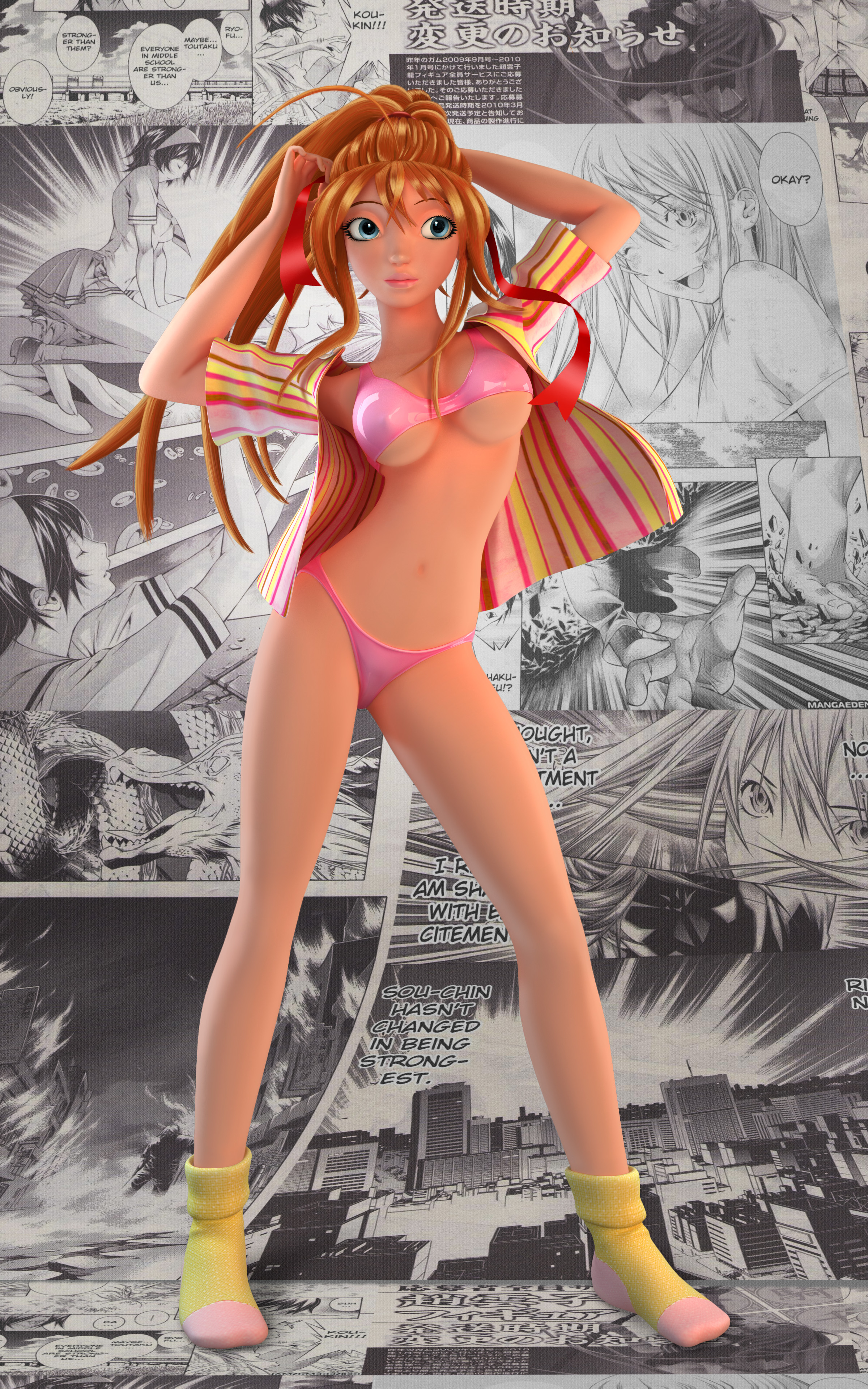 Hay un par de cosas que comentar. Por una parte, al subir los brazos tan alto la clavícula mira un poco para arriba, me resulta difícil el hacerlo, pero queda bien si se hace correctamente. Y luego otro detalle difícil que puede resultar agradable es enfatizar la ropa ajustada apretando las (pocas) mollas que estén cubriendo, como aquí (la imagen es una obra de hinemaru, en pixiv. No es mía bajo ningún concepto y la pongo como mera información).