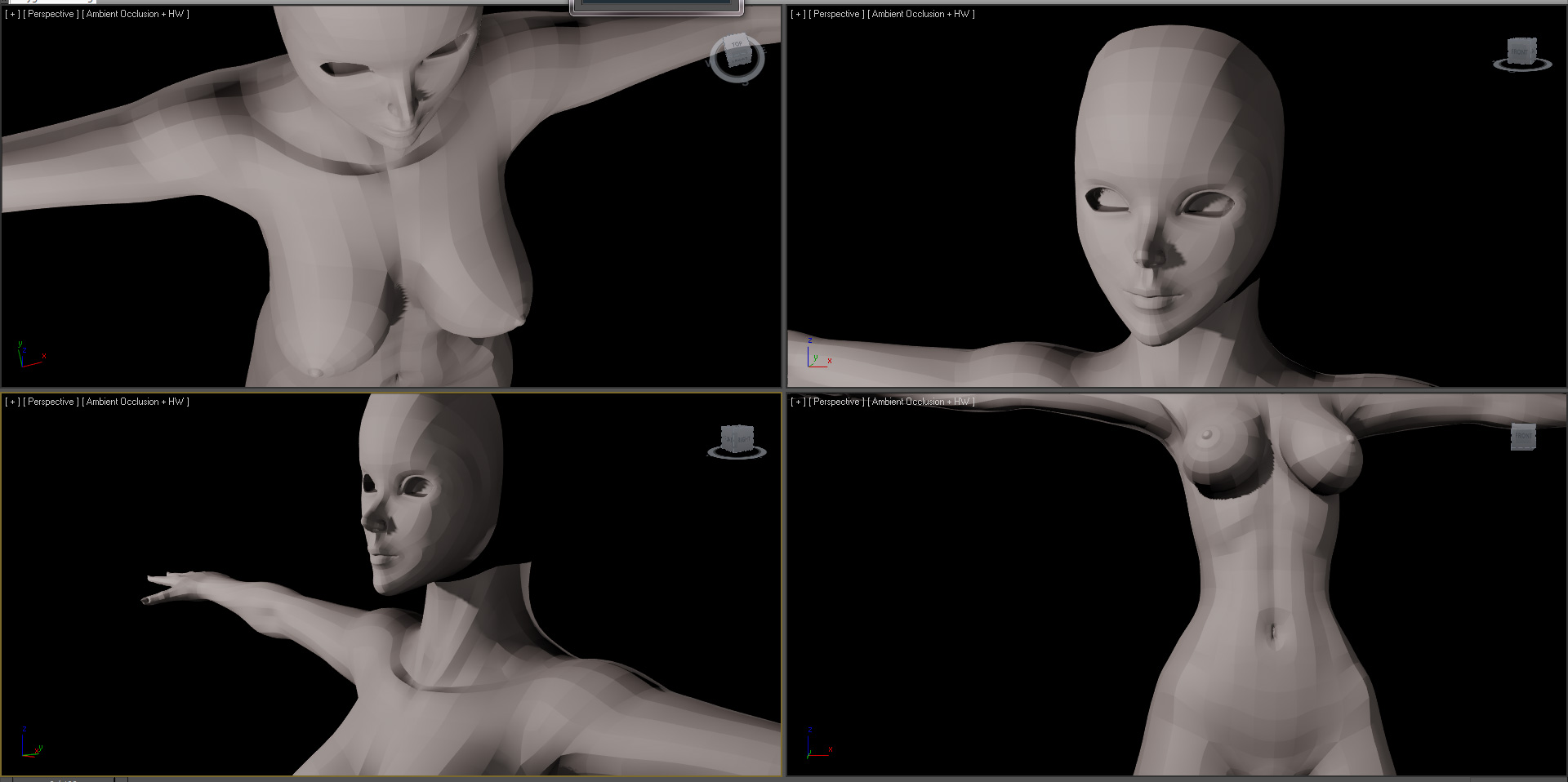 Intentando hacer un cuerpo femenino (aunque de momento de ahí puede salir cualquier cosa, es andrógino) de mínima resolución y de líneas limpias, porque siempre me he hecho un lío en zonas difíciles, donde no me cuadraba el número de polígonos, juntar seis segmentos con una zona donde hay sólo dos, etc.