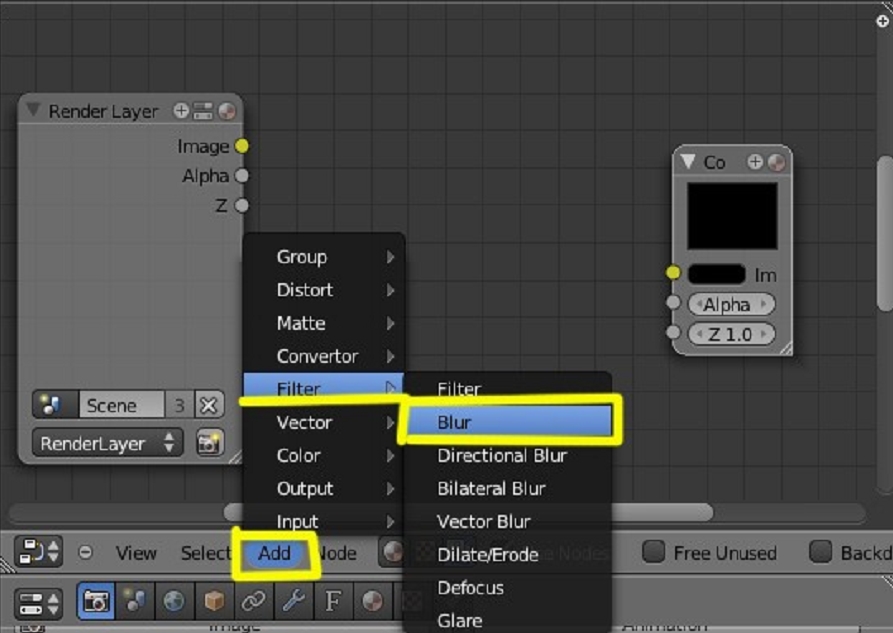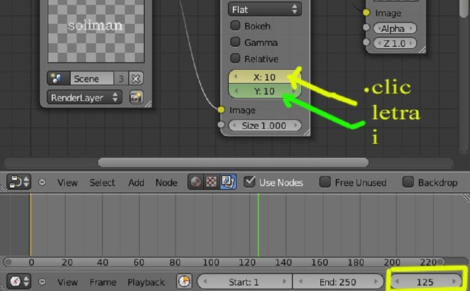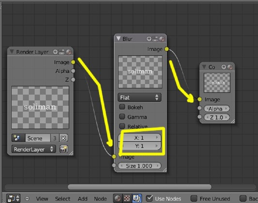 Abrimos una ventana de nodos y seleccionamos el compositing nodes y marcamos la casilla use nodes. Quitamos el lazo que los une y vamos a añadir un filter blur, una vez lo tenemos enlazamos las tres ventana y le ponemos un valor muy bajo a los ejes del blur (por ejemplo, x:1 y, y:1):