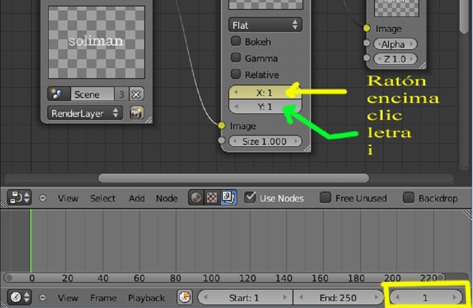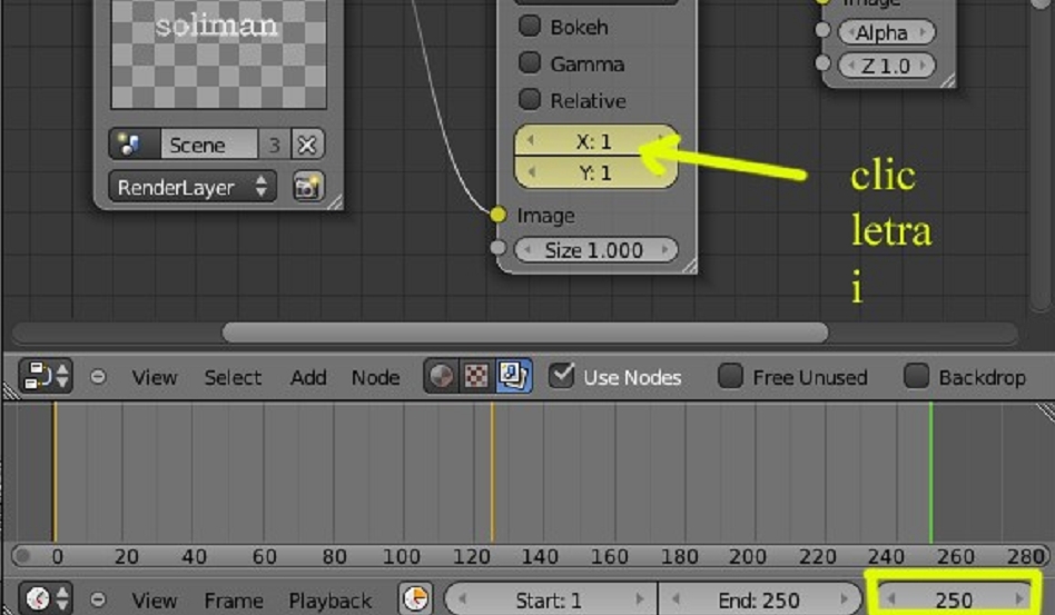 Y por último, nos colocamos en el frame 250 > cambiamos el valor a 1 en las dos coordenadas y otra vez letra i.