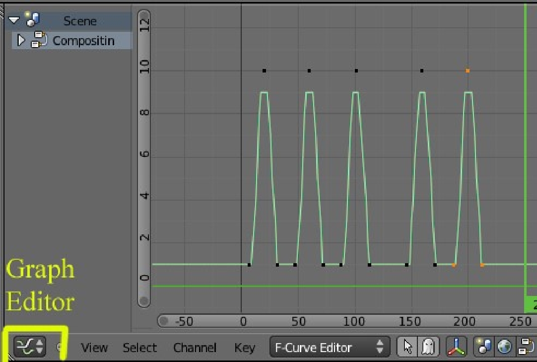 Si hacemos el video ahora, veremos una animación bastante lenta, por lo que me he ido al editor gráfico y he cambiado los valores ajustándolos y duplicándolos, hasta tener una cosa como en la imagen. Se puede escalar presionando la tecla s > x y moviendo el ratón. Duplicar es shift+d y mover el duplicado: