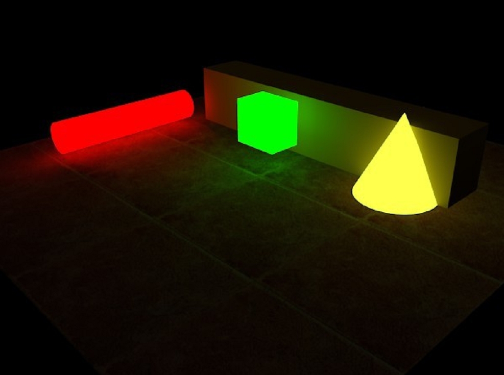 Podemos crear un efecto luminoso, utilizando indirect lighting y subiendo el valor del emit de los materiales, vamos a crear una escena simple, para ver el efecto que produce la iluminación. Para ello he creado tres cilindros y dos planos. Uno lo he puesto vertical para que se aprecie la iluminación que llega a él. Solo decir que no he puesto ninguna lámpara en la escena y el world lo he puesto completamente negro:
