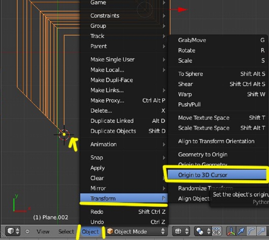 Y ahora solo tenemos que indicarle que coloco el origin en donde tenemos posicionado el cursor. Esto se hace desde estando en object mode, y object > transform > origin todo 3d cursor: