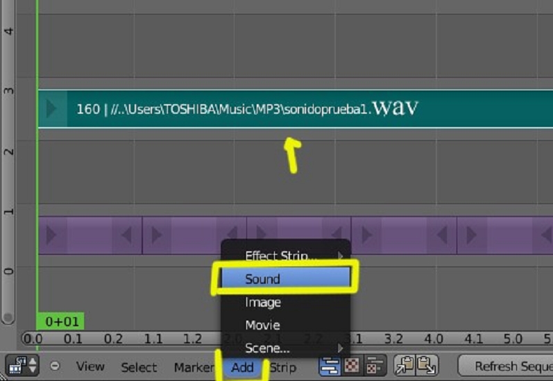 También podemos añadir algún sonido o música (*.wav) o (*.mp3). Solo hay que ir a add > music, buscar el sonido y colocarlo en el editor: