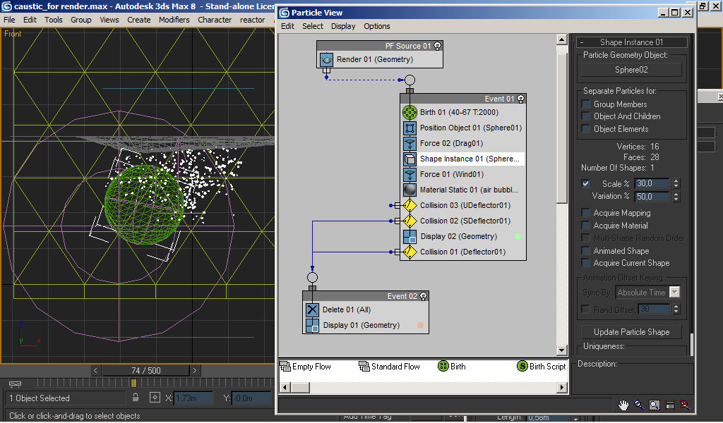 El otro inconveniente antes mencionado, las burbujas deberán no penetrar la esfera, y para eso se le ha colocado un deflector esférico del mismo tamaño que ella. Pero allí surge otro problema, pues las partículas son emitidas desde el centro de la geometría de la burbuja y el centro del polígono emisor, por lo que desde el comienzo de la emisión ya el 50% de la burbuja existe interpenetrada con la esfera de vidrio, una manera fácil de solucionar esto era disminuir el diámetro del deflector esférico a un valor menor que el de la esfera, pero esto hacía que muchas burbujas viajaran hacia arriba interpenetradas superficialmente con la esfera (sin introducirse completamente ni separarse del todo) produciendo severos artefactos de render en Mental Ray (puntos negros profundos en donde la interpenetracción ocurre) debido a una interrupción en el trazado de rayos.