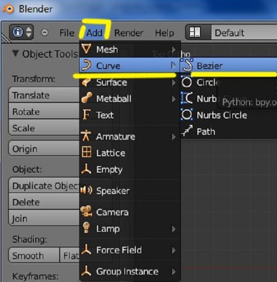 Para eso presionamos sobre la figura del cubo, y seleccionamos la curva que tenemos en escena, que en este caso se llama béziercurve:
