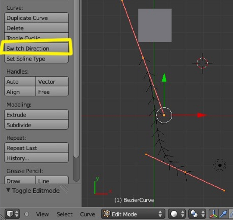 Añadimos el cubo y la curva Bézier, y lo primero que vamos a mirar, es la dirección que tiene la curva. Para eso, seleccionamos la curva, y nos ponemos en Edit Mode: