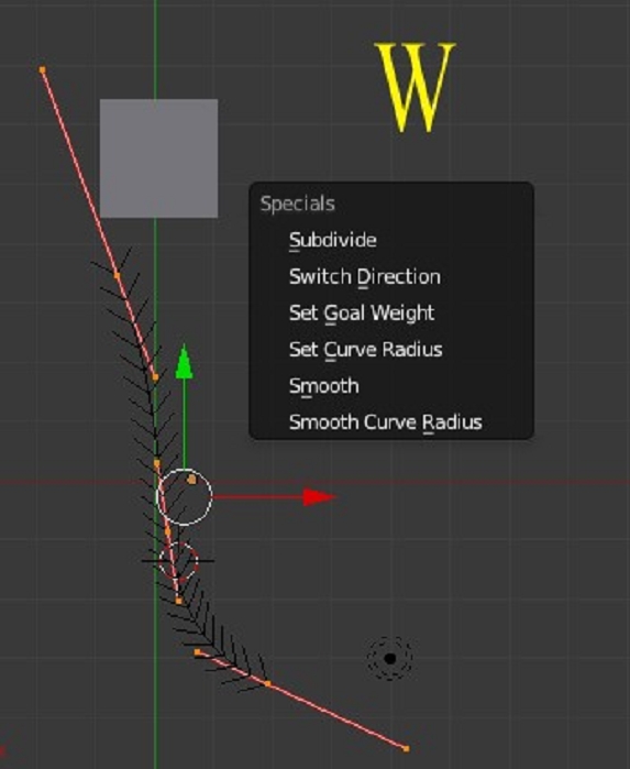 Switch direction, para cambiarles el sentido, también podemos subdividir la curva, una o varias veces, para luego manipular los handles y crear la ruta del desplazamiento que deseamos, si presionamos w, veremos un panel donde podemos subdividir o cambiar la posición de la dirección: