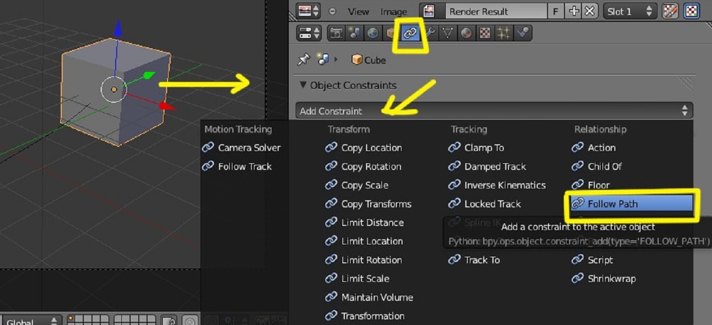 Una vez que hemos dibujado la ruta por dónde se va a mover el cubo, vamos a seleccionar este para añadirle una constraint, se trata de una constraint de tipo relationship > follow Path. (la traducción viene a ser. Restricción > relación > seguir el camino):