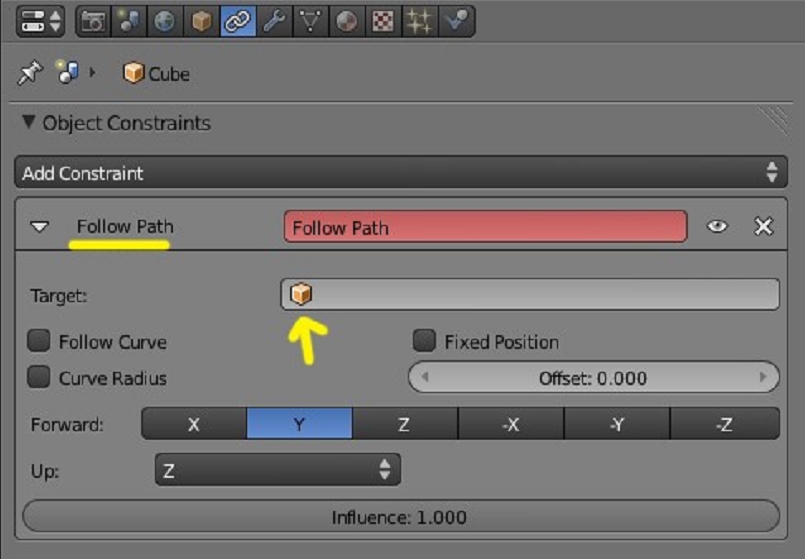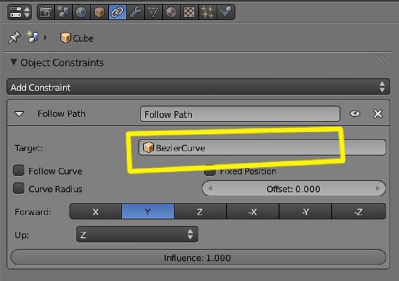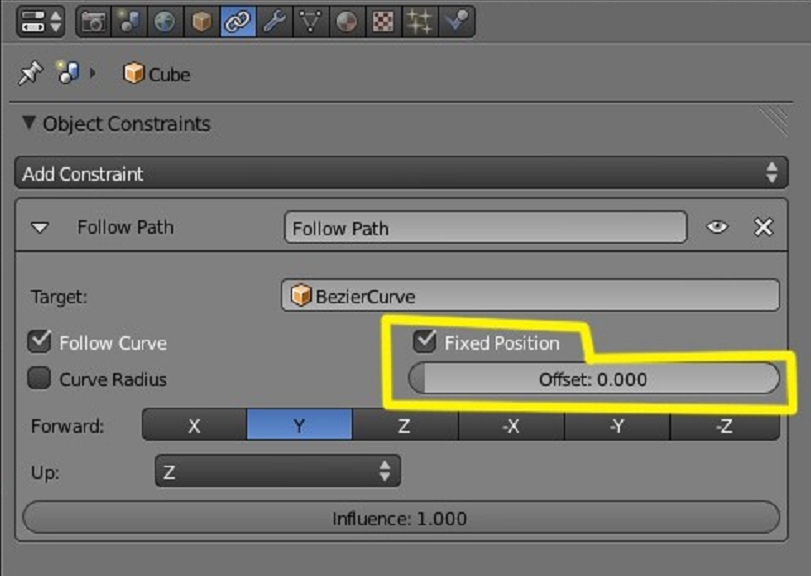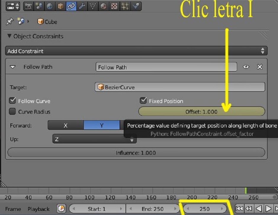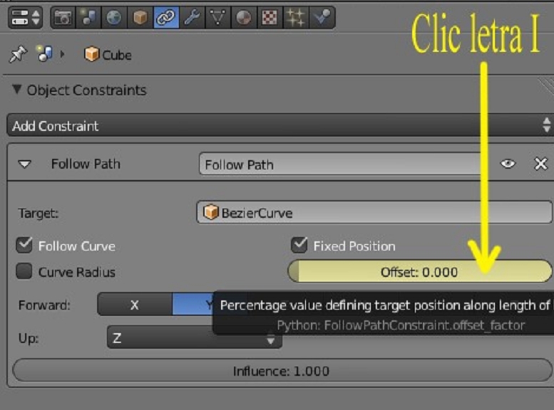 Puede darse el caso, de que el cubo, se mueva de la posición en la que lo teníamos. Para rectificar esto, con el cubo seleccionado, presionamos Alt+g para limpiar ese movimiento, en el lado izquierdo hay una casilla llamada follow curve, que debemos marcar, para que el cubo siga el camino de la curva a la vez que encara esas curvas, eso quiere decir, que el objeto ira rotando a la izquierda cuando la curva sea a ese lado, y a la derecha cuando la curva sea a ese otro lado. Si no marcaramos esa casilla, el cubo, siempre avanzaría orientado a la posición original, y para animar mejor el objeto, vamos a marcar la casilla fixed position que lo que hace, es que cambia la barra inferior y en vez de utilizar los valores negativos, que tendríamos que utilizar para animar el cubo, los valores vayan del 0.000 al 1.000 (cero al uno):