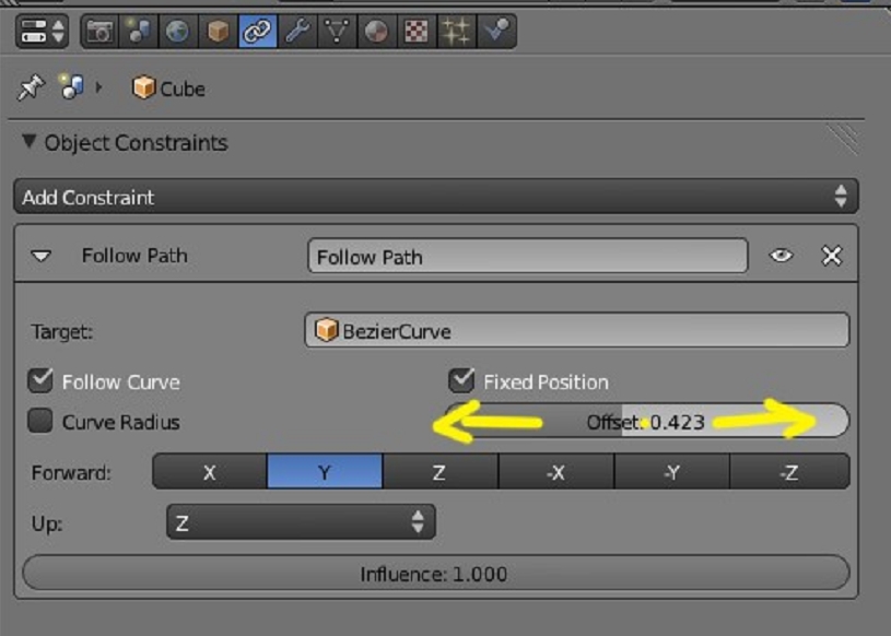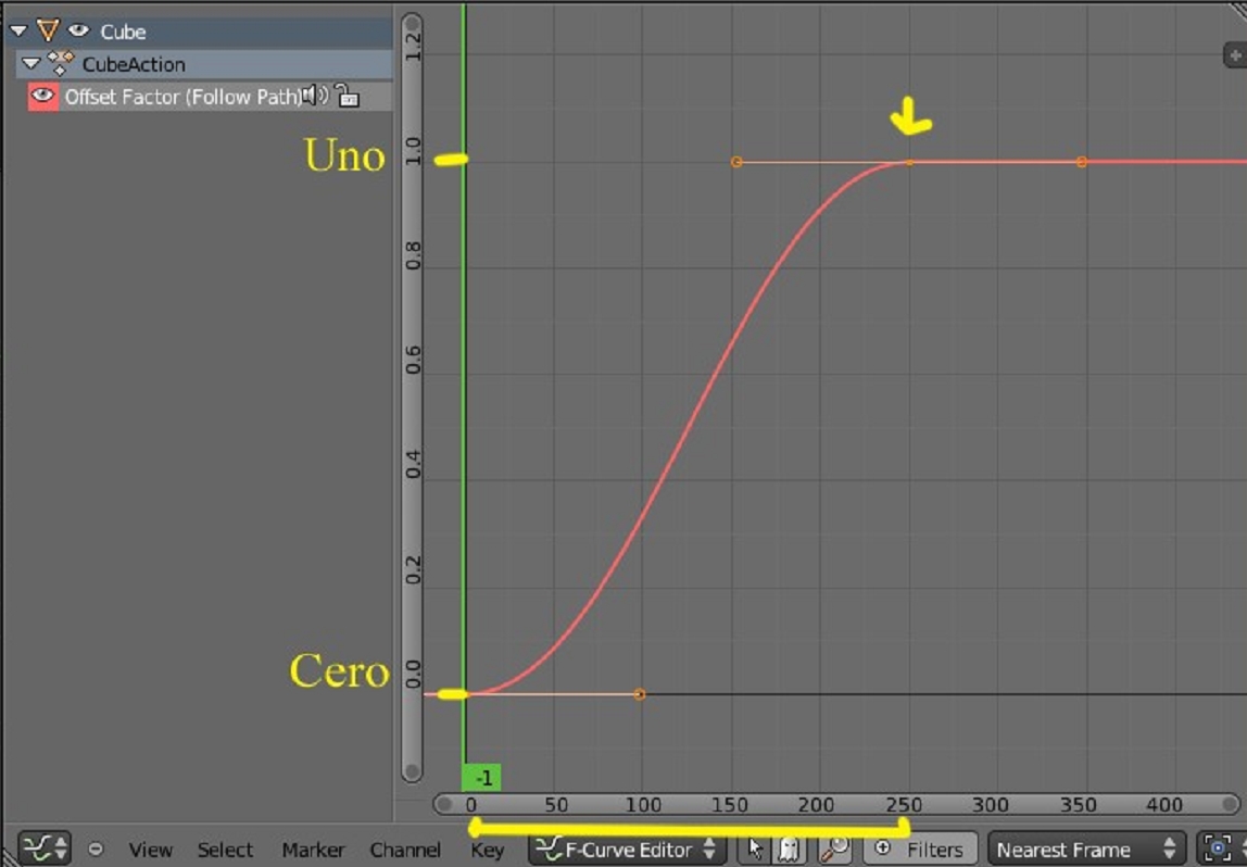 Para hacer una prueba, movemos la barra de offset y veremos que el cubo se desplaza por la curva: