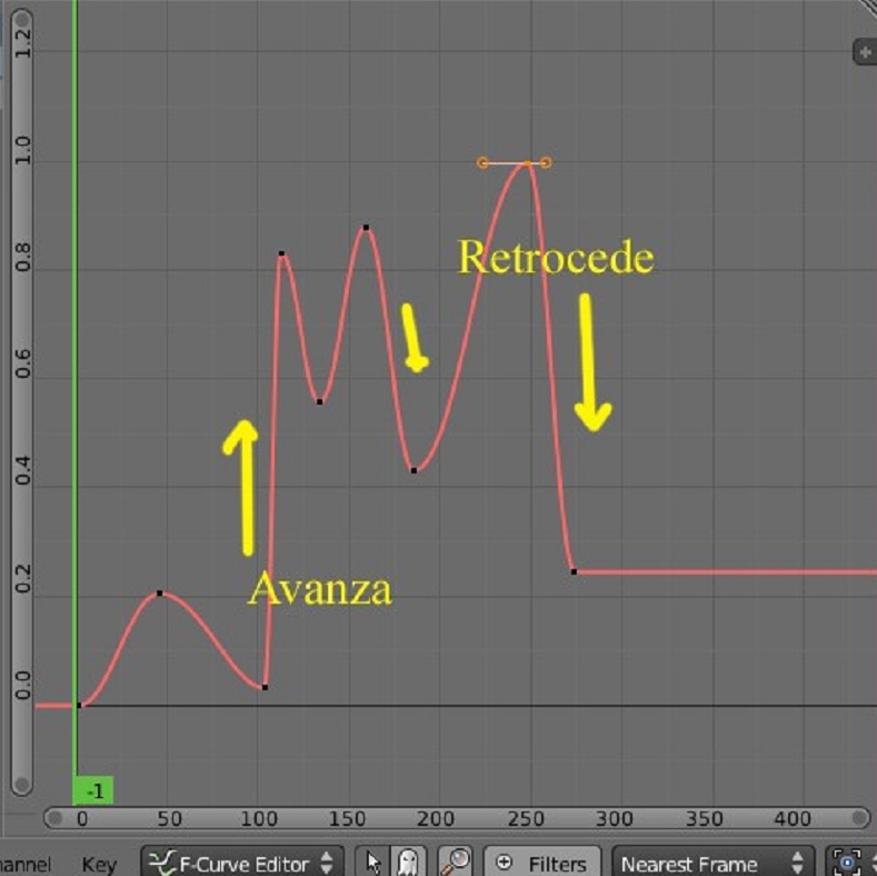 Por supuesto, que podemos modificar la curva en el mismo editor con solo hacer Control + clicizquierdoratón o moviendo los handles con clicderechoratón y moviendo, un ejemplo es la siguiente imagen, donde todo lo que son subidas, el objeto avanzara y todo lo que son bajadas, el objeto retrocedera: