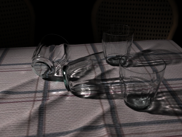 Escena realizada con Mental Ray con Caustics. Sólo un Mental Ray Spot se ha colocado desde la izquierda. El vidrio es un material DGS phenomena.