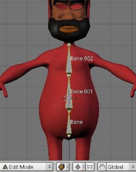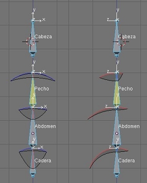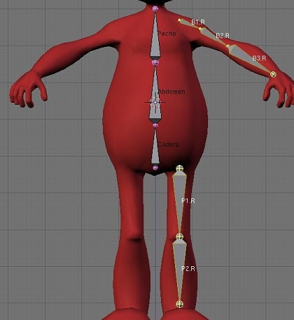 Cargaremos el modelo de nuestro personaje en la vista frontal. Si bien podríamos crear el armature completamente sin la ayuda de ningún personaje modelado, el tenerlo allí como referencia será útil a los fines didácticos, colocaremos el personaje en el centro de coordenadas, y allí ubicaremos el cursor. Vamos a crear un armature de tres huesos verticales como hemos visto en el capítulo anterior. Los 3 huesos harán las veces de cadera, abdomen y pecho por lo que les daremos dimensiones apropiadas. Crearemos los tres huesos haciendo click en la pantalla con Control pulsado. Una vez terminados, los ajustaremos para que queden perfectamente verticales. Les daremos nombres apropiados a cada uno.