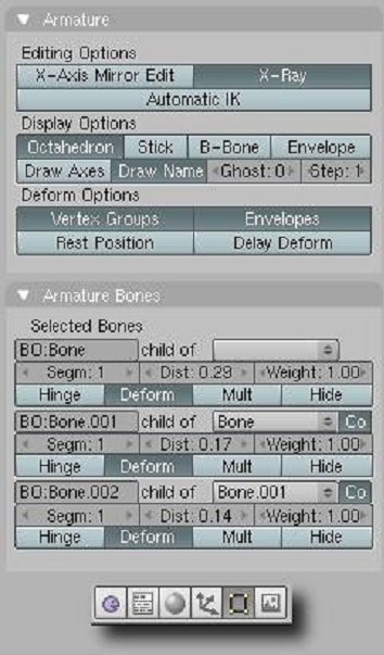 Bisagras (hinges en inglés), cualquier hueso puede ser configurado como una bisagra con lo cual, la rotación del hueso precedente, no lo afectara de ninguna manera. En este caso lo que deseamos es que la rotación del hueso p2 no afecte a la orientación de los huesos p3, o lo que es lo mismo, queremos que p3 sea un hueso bisagra, para ello seleccionaremos el hueso p3 en modo edición y pulsaremos el botón.