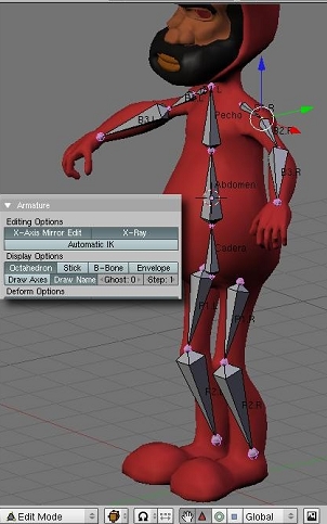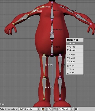 Activaremos la opción x-axis mirror edit en los botones de edición. Con esta opción activada y habiendo nombrado los huesos siguiendo la convención. R/. L, al editar una mitad del armature se actualizaran los cambios en la otra mitad, hasta ahora habíamos trabajado exclusivamente en la vista frontal, no tenemos idea del aspecto de nuestro armature en la vista lateral, pero les aseguro que no está nada bien, teniendo activado el x-axis mirror edit solo deberemos preocuparnos de editar una mitad del armature. Haremos entonces los ajustes necesarios en la vista lateral. Sera de suma utilidad emplear los controles de traslación (widgets) accesibles a través del icono de la palma en la cabecera de la ventana 3d, la idea es que los huesos queden totalmente cubierto por la malla del personaje, como lo estarían los huesos cubiertos por carne en una persona real.