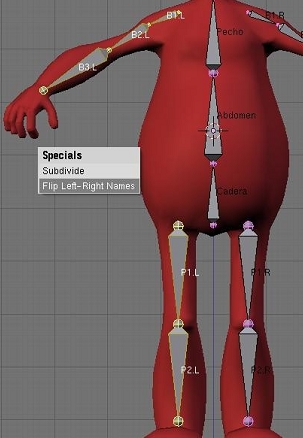 Tenemos ahora las dos cadenas en la posición opuesta, pero con nombres inútiles para nuestros fines. Seleccionaremos únicamente estas dos cadenas, y pulsaremos w y la opción flip left-right names. Ya está, tenemos ahora un armature básico listo.