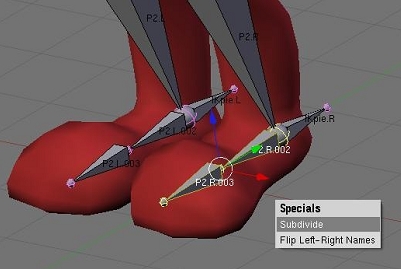 Seleccionaremos la cola del hueso p2. R y extrudiremos una vez hacia atrás en la vista lateral (fácilmente pulsando la tecla y luego de la e de extrudir), veremos que al mismo tiempo un hueso homólogo se crea en la otra mitad del armature, volveremos a seleccionar la cola del hueso p2. R y otra vez extrudiremos, pero esta vez hacia adelante hasta la punta del pie (otra vez usaremos la tecla y para restringir a esa coordenada). Seleccionaremos este hueso entero, y los subdividiremos.