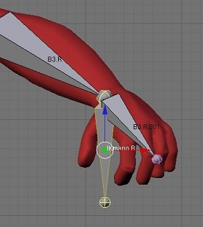 Seleccionaremos el armature y entraremos en modo pose. Vamos a crear una restricción llamada IK Solver en las extremidades de nuestro personaje que es la manera de aplicar en Blender la teoría explicada antes, seleccionaremos el hueso IKmano. R, y luego el hueso b3. R. Ahora pulsaremos Control + i y elegiremos la opción todo selected bone. La lógica de selección sería, primero el target, luego el hueso que alojara la restricción, si bien hemos decidido usar huesos como blanco de las restricciones IK, también es posible utilizar empties. Usar uno u otro dependerá de la situación, a veces es más sencillo utilizar empties, otras veces convendrá utilizar huesos.