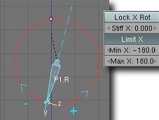 Para cada hueso que forma una cadena IK podemos optar entre bloquear completamente la rotación sobre cualquier eje local, o bien restringir esta rotación entre un par de valores desde -180 a +180 grados. Estos ángulos deben entenderse como tomados desde el cero en el eje local del hueso en reposo, y teniendo valores positivos en sentido antihorario, de la misma manera que se hace normalmente.