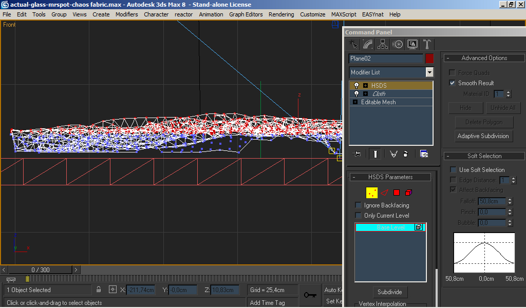 Y se aplica subdivide, generándose así una jerarquía de subdivisión suficiente para redondear las crestas filosas de la tela sin necesidad de aumentar el poligonado de toda la malla, y al ser paramétrico HSDS puede desactivarse y/o modificarse y trabaja la topología de manera muy inteligente logrando pliegues verdaderamente suaves.