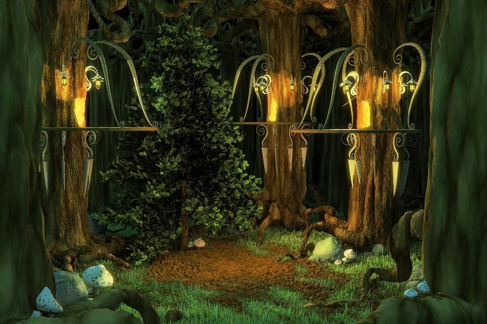 Veo que los árboles tienen orificios por el cual emerge una luz, yo probaría ponerle una luz volumétrica muy suave y cerca a los agujero le pondría unos bichos volando para darla más vida aún.
