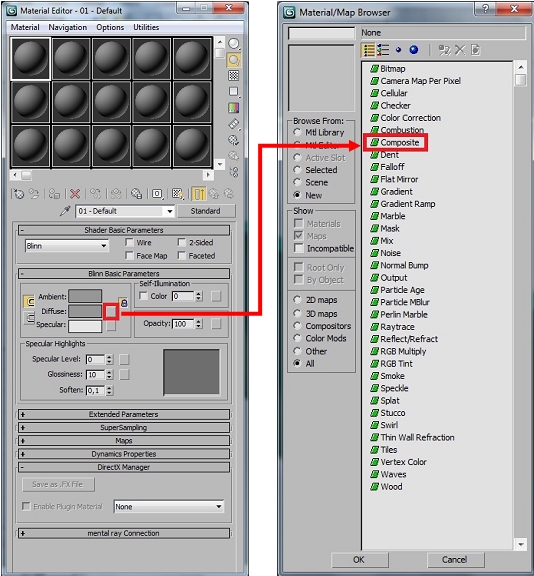 Con nuestra geometría lista, abrimos el material editor y pulsamos en Diffuse. Se abrirá el material/map browser, donde haremos doble clic en composite.