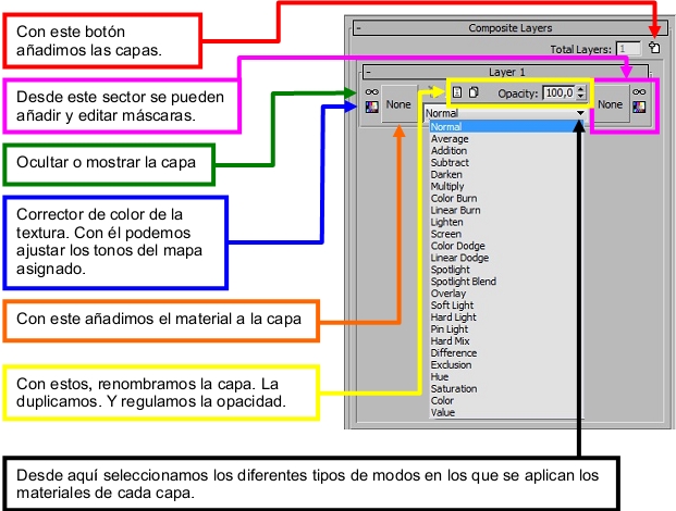 Uso de máscaras: otra de las grandes utilidades del material composite es la posibilidad de con el botón de la derecha de un layer determinado, añadir una máscara para hacer transparentes ciertas partes del bitmap. Con el editor de color se podrían tratar los bitmaps, para determinar que colores cambiamos a negro y por consiguiente hacemos.