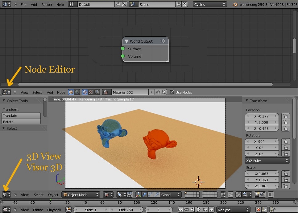 Una vez activado, ya estamos trabajando con Cycles, como Cycles casi todo lo que trabaja, son nodos, creo que lo mejor es dividir la pantalla en dos y poner en una de ella una de tipo Node Editor: