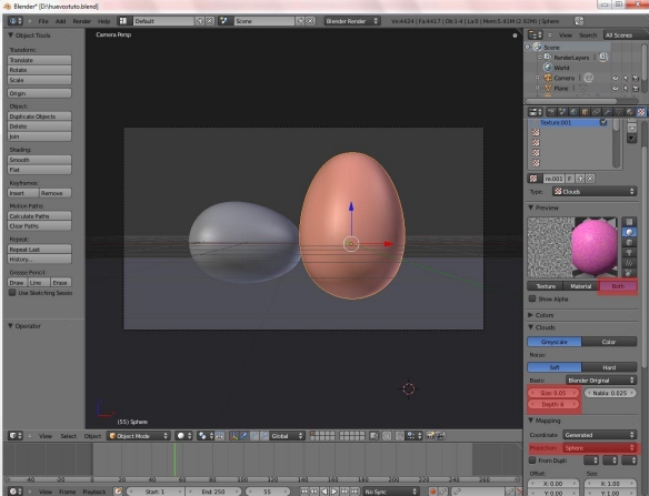 Vamos al panel influence disminuimos el color a 0.214 y activamos Nor a 0.02 aproximadamente y cambiamos el color de la banda fucsia a un tono de rosa distinto, color: cuanto color de textura aplicar a nuestro objeto Nor: o normales es muy útil ya que proporciona relieve en nuestro objeto mediante la textura que hacemos, nuestra cascara esta lista para darle el mismo material a otro huevo, seleccionamos primeros el huevo gris manteniendo presionado la tecla shift seleccionamos el huevo rosa Control + l y luego materiales nuestros dos huevos son ahora rosas, para finalizar con los materiales vamos a añadir la textura al piso.
