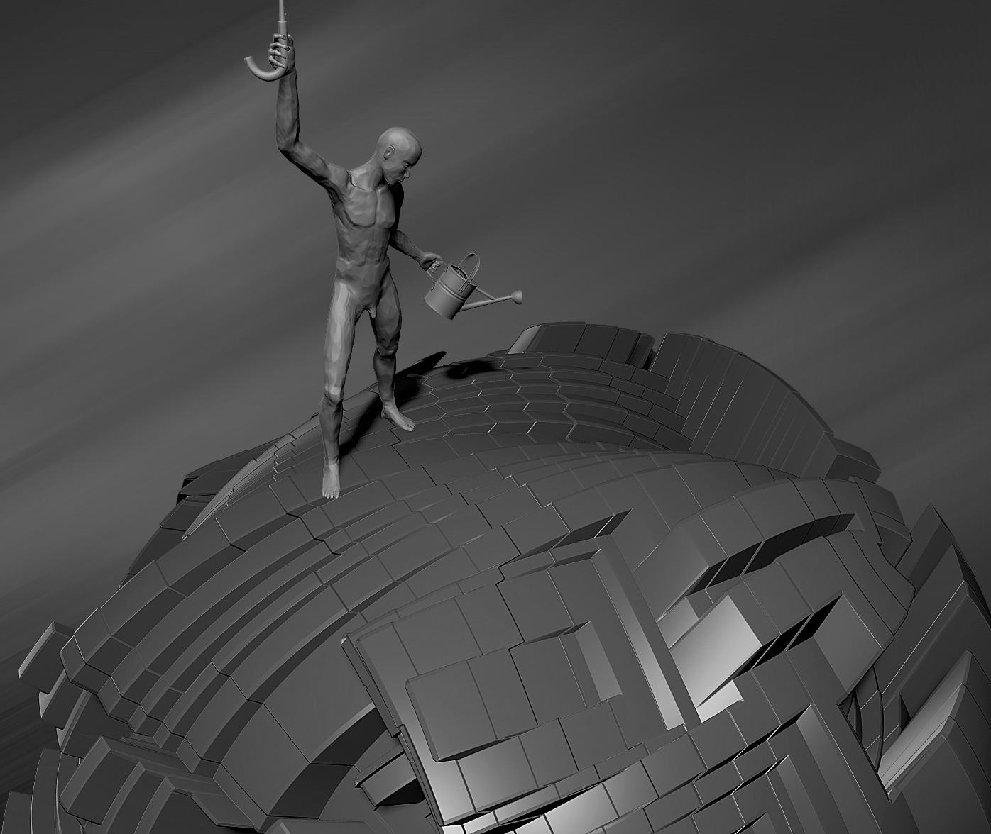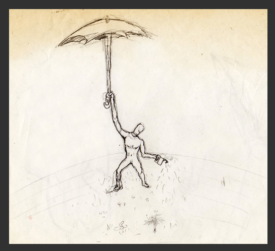 Retomando un viejo modelo: el hombre que regaba desiertos. El tema viene de muy atrás, cuando me encargaron un cartel de temática ecologista, la cosa al final sólo quedó en un boceto chusco, de ahí nace este personaje.