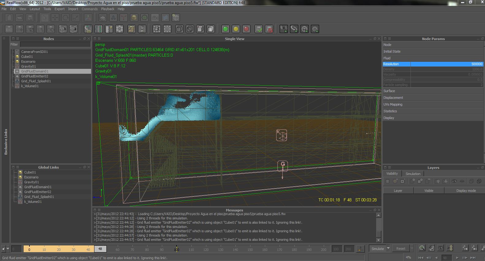 En cuanto al problema que comentas resulta raro, lo que dices, si está bien los exclusive enlaces debería colisionar el agua contra la geometría, prueba a poner a modo de descarte a simular sin exclusive enlaces y todo en global enlaces a ver qué te sale, si te sigue sin colisionar nada de nada, asegúrate que la geometría y todo está correcto, que no tienes en el max las normales invertidas ni nada de eso.