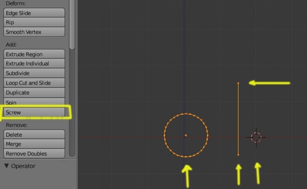 Para crear un muelle, vamos a utilizar la opción screw, el secreto está en la colocación del objeto y del cursor. Como se ve en la imagen de abajo, he creado un círculo (add > Mesh > circle)