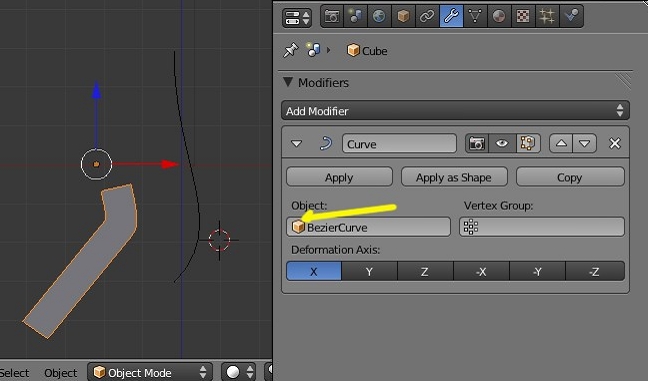Una vez tenemos la curva, seleccionamos el objeto que hemos creado y subdividido y le añadimos un modificador de tipo curve, y en la parte que pone object: seleccionamos el nombre de la curva que en este caso es béziercurve.