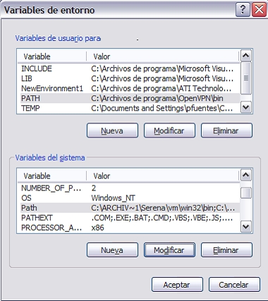 Para ello pulsamos en inicio->panel de control->sistema ->pestaña avanzado->variables de entorno y en las variables de sistema añadimos las nuestras, copiamos copy libpython25.ade c:\python25\libsa c:\build\lib\Windows\Python\lib.