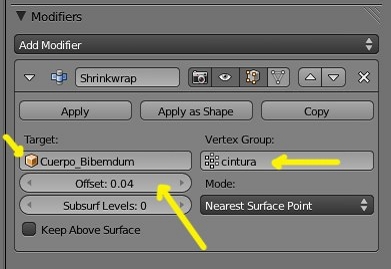 Y nos saldrá una ventana donde debemos indicarle, el nombre del objeto sobre el que quieres que se amolde, y en este caso el cuerpo se llama cuerpo_bibemdum. Como no es toda la falda lo que queremos que se pegue al cuerpo, sino que es solo la cintura y por eso hemos creado un grupo de vértices con ese nombre, pues se lo ponemos en la parte de vertex group: y por último, como la cintura se queda tan pegada al cuerpo que queda mal, le subimos un poco el valor de offset: que lo que hace es que separa un poco el objeto del otro.