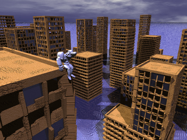 Oh, una ciudad gris medio erosionada, como con un modelado procedural (con un hombre del mismo material sentado en una cornisa)?