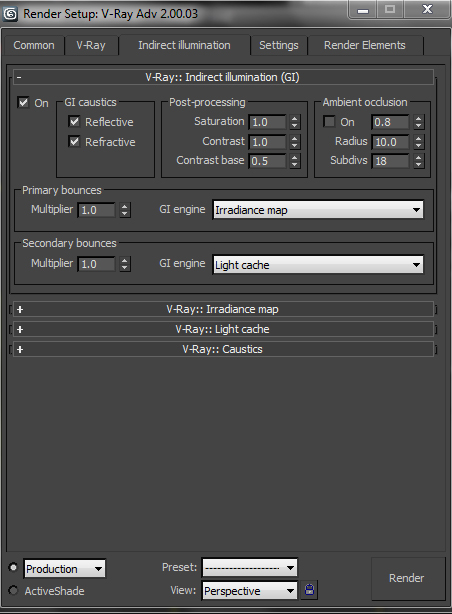 Uso Irradiance Map en primary bounces y Light Caché en secondary bounces.