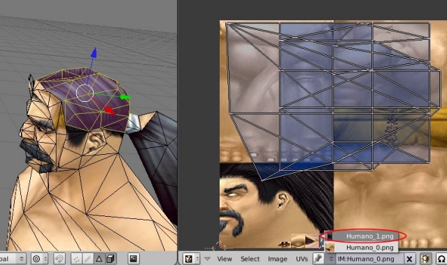 Una vez seleccionada un área, abrimos la segunda textura (en este caso humano_1.png) y, aunque los cambios son visibles desde la ventana 3d, la ventana del UV/Image Editor muestra la textura anterior. Esto es debido a que he seleccionadoparcialmente una isla del mapa de coordenadas y existen caras aplicadas sobre ambas texturas. Luego podremos ir seleccionando individualmente las caras no seleccionadas desde la ventana 3d y cambiarle la textura cómo se muestra a continuación, seguimo modificando más áreas, pero esta vez después de la selección sólo seleccionamos la textura del cabello desde la lista de texturas.