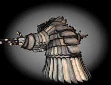 This plate is the base for all others in the model. I had made the plate-armor in strips. I used a plate, a curve, the array modifier, the curve modifier and some lattices.