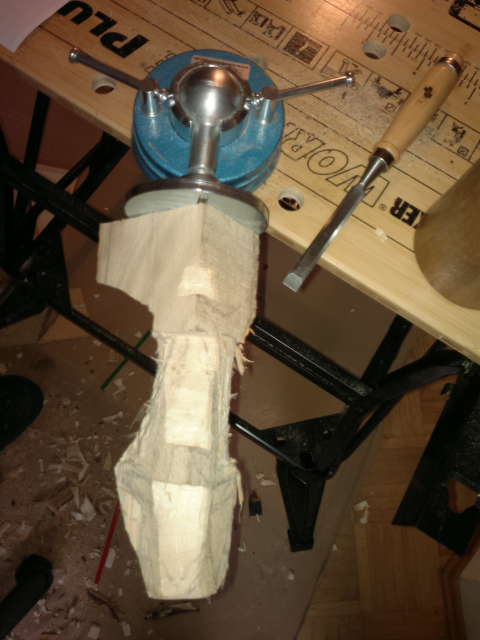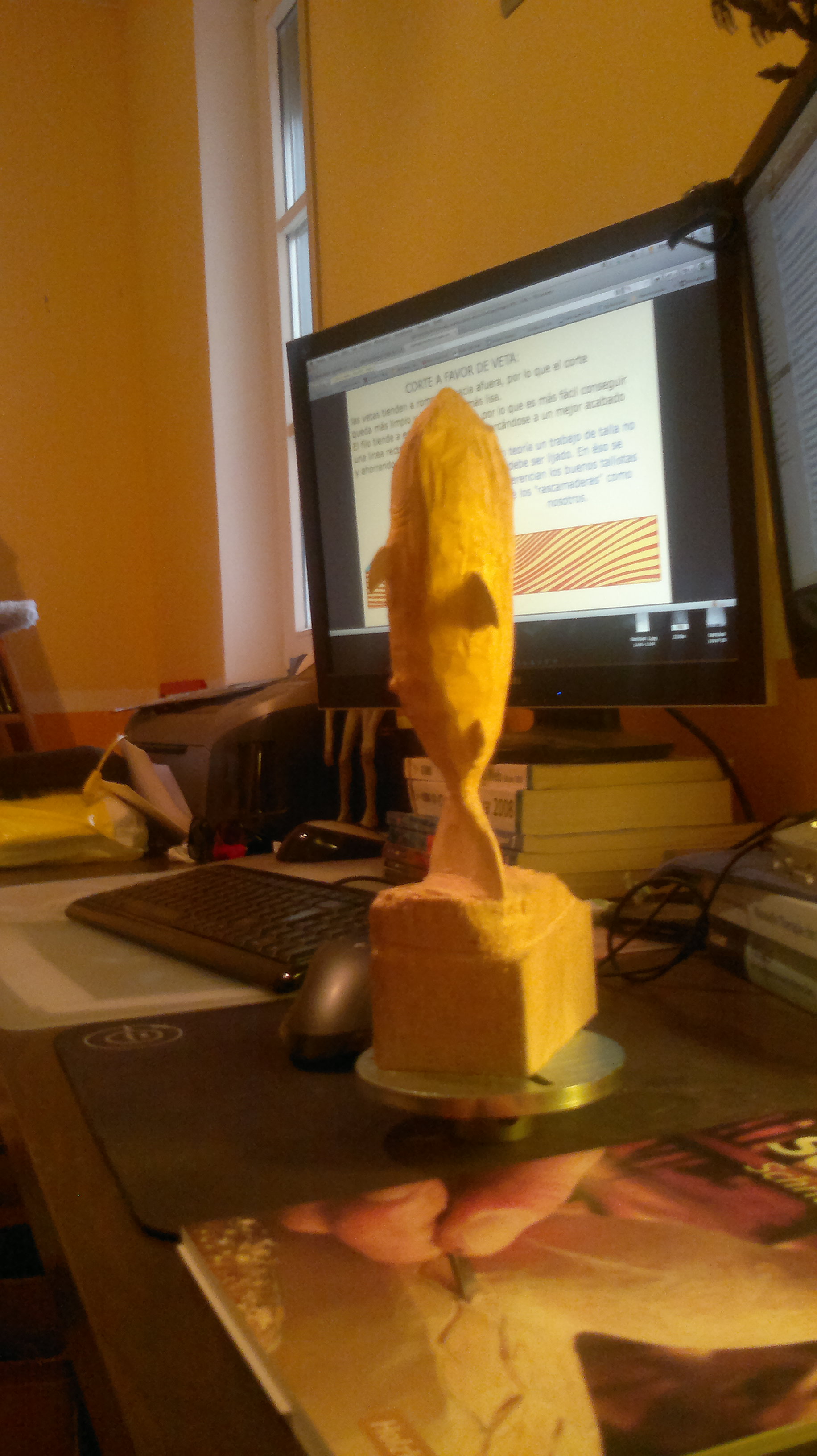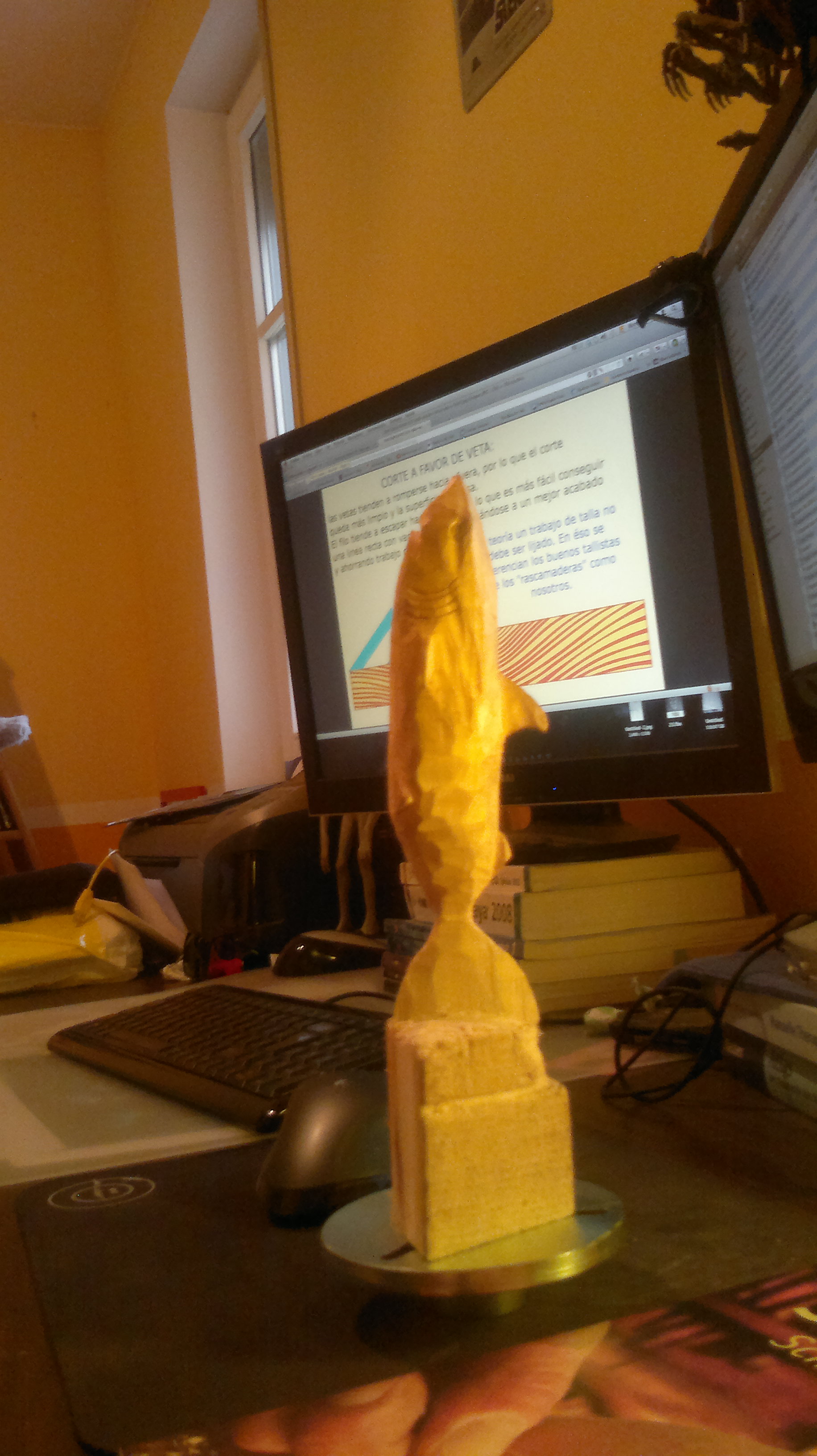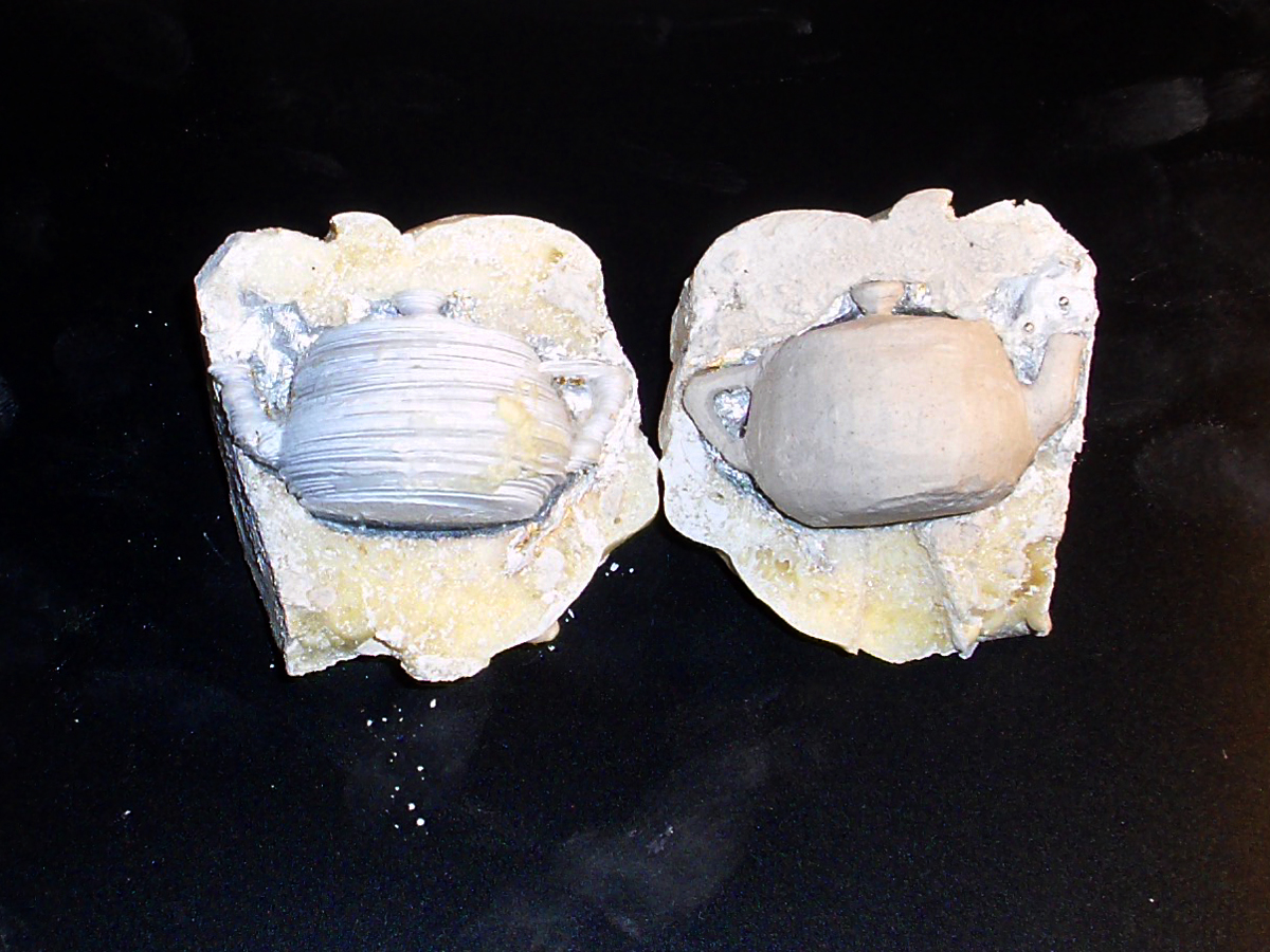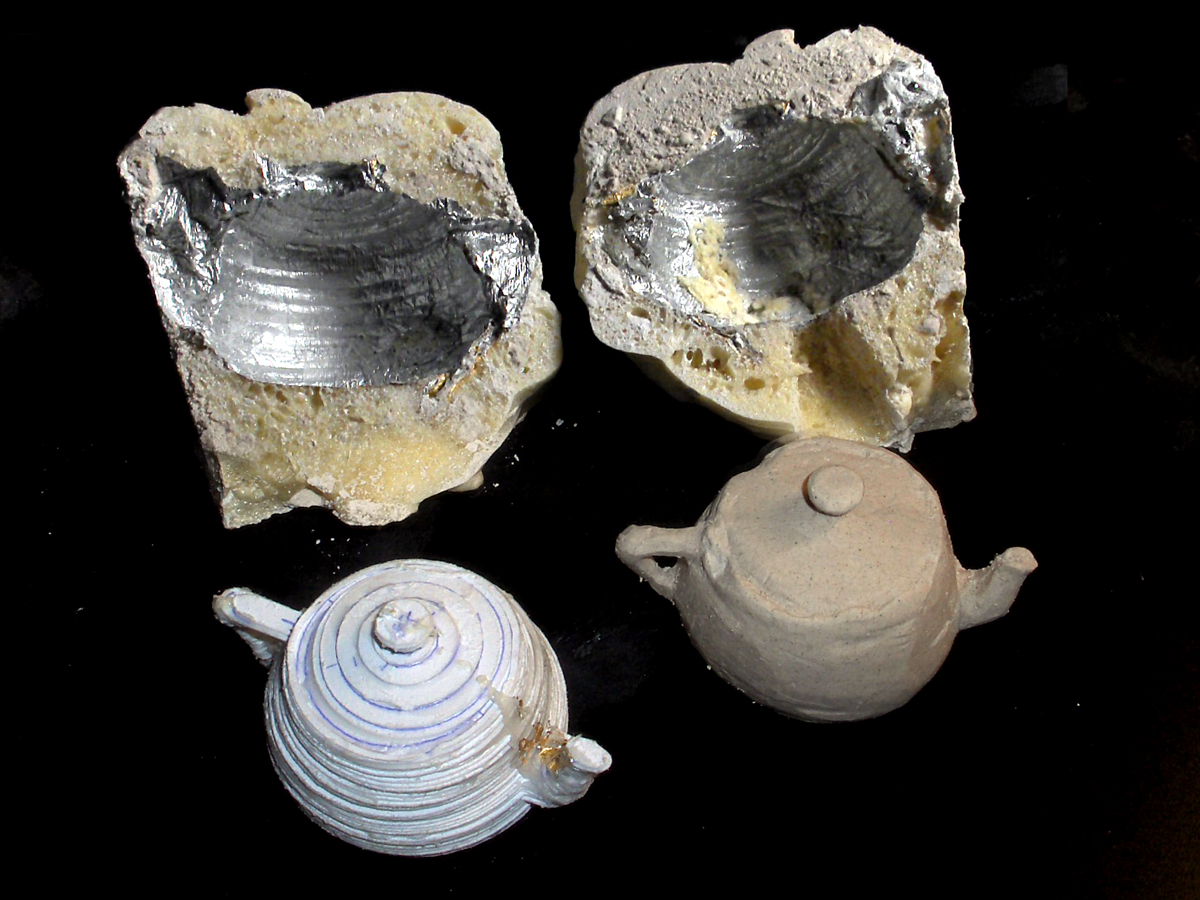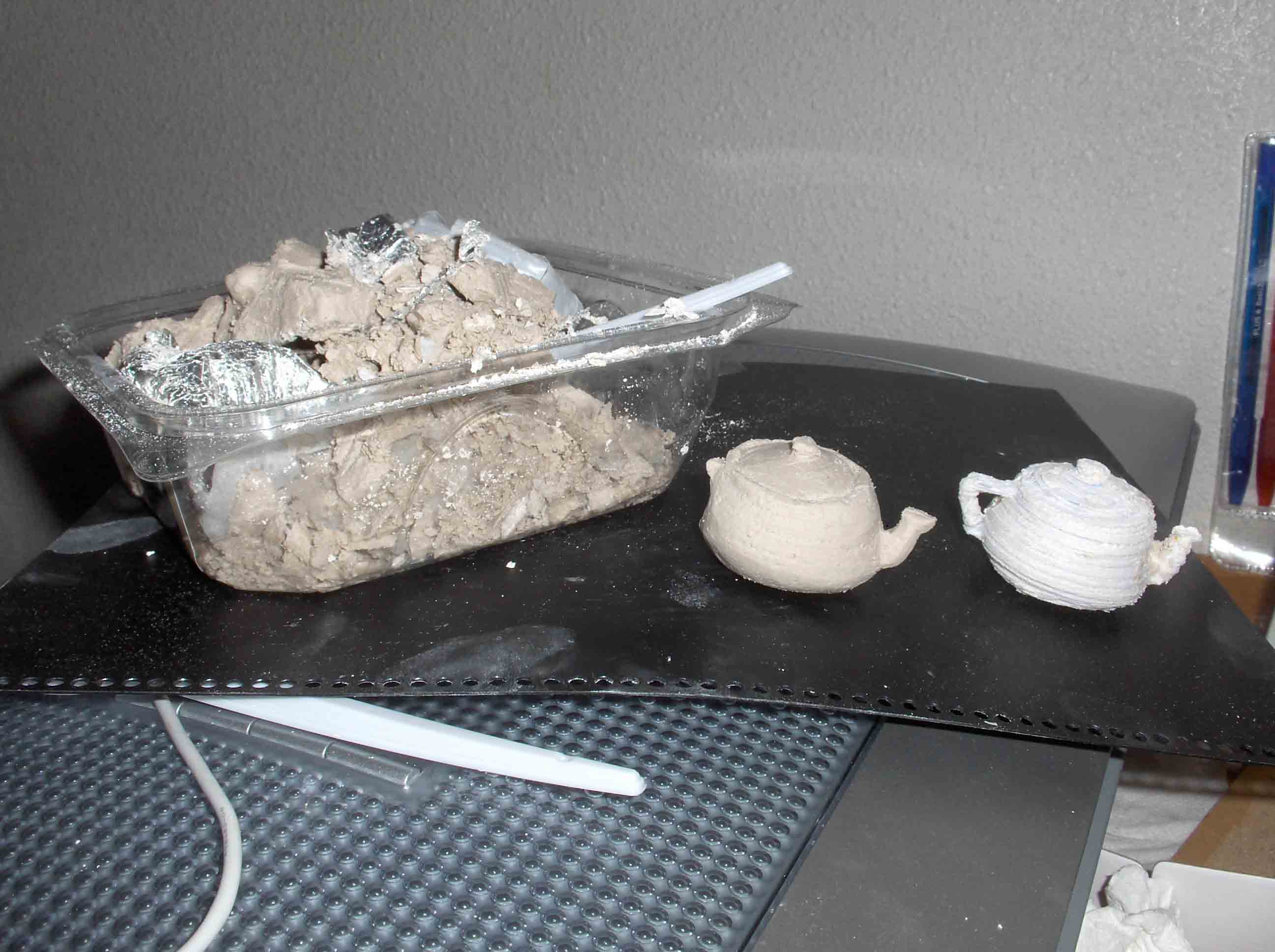 Y el resultado, tuve que romper el molde para sacar la tetera escayola, porque se había pegado al aluminio tanto como la escayola original, la proporción escayola/tetera empieza a alcanzar proporciones alarmantes, además, hay tiempo considerable de talládo después.