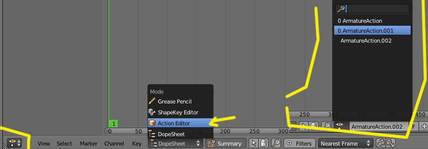 Cuando entres al dopeshet selecciona la opción del editor de acciones (action editor) y verás un recuadro donde puede seleccionar todas las animaciones que tengas guardadas.