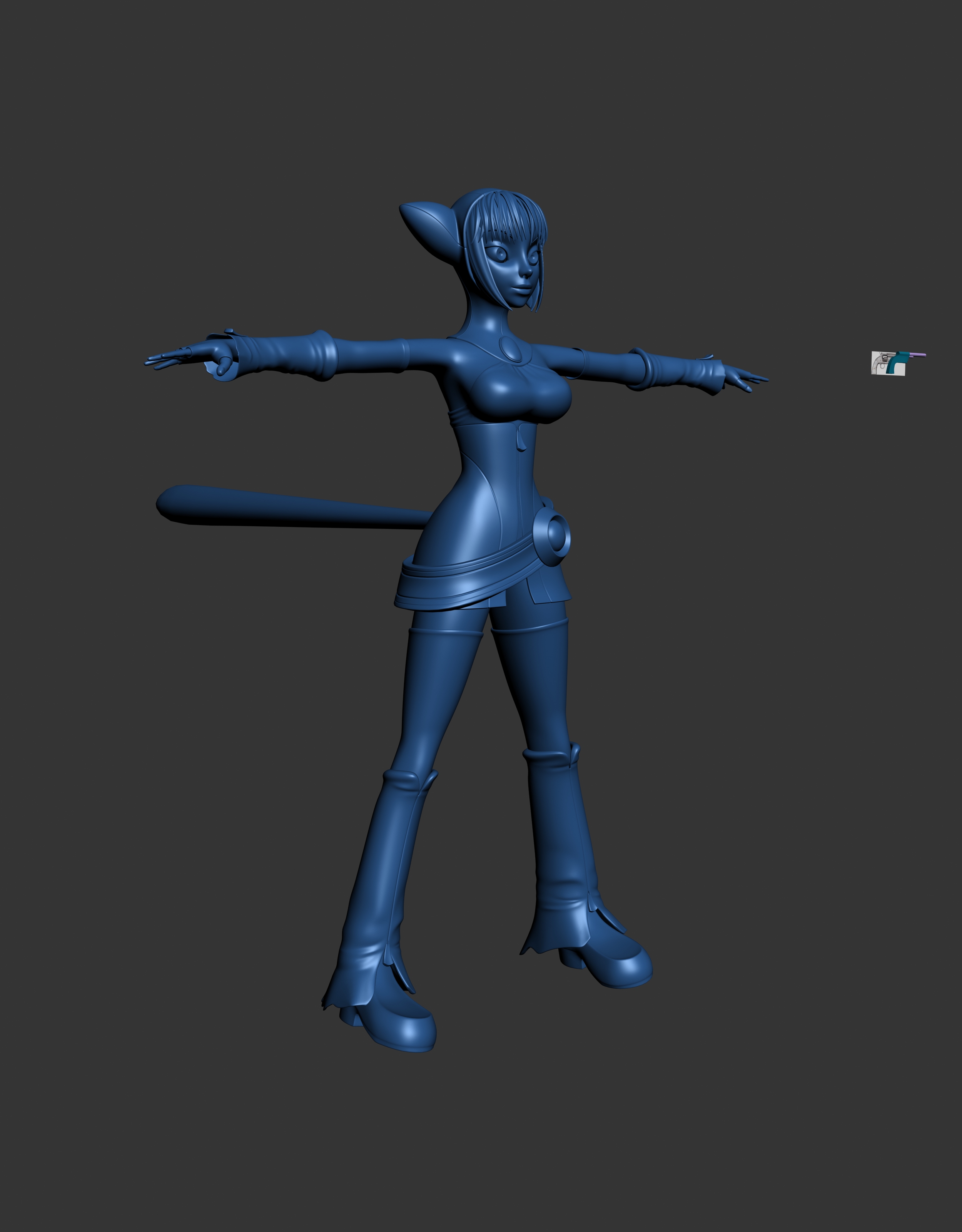 Me falta modelar la pistola y comenzar con el mapeado UV, texturizar, riggear y dar la postura, bastante.