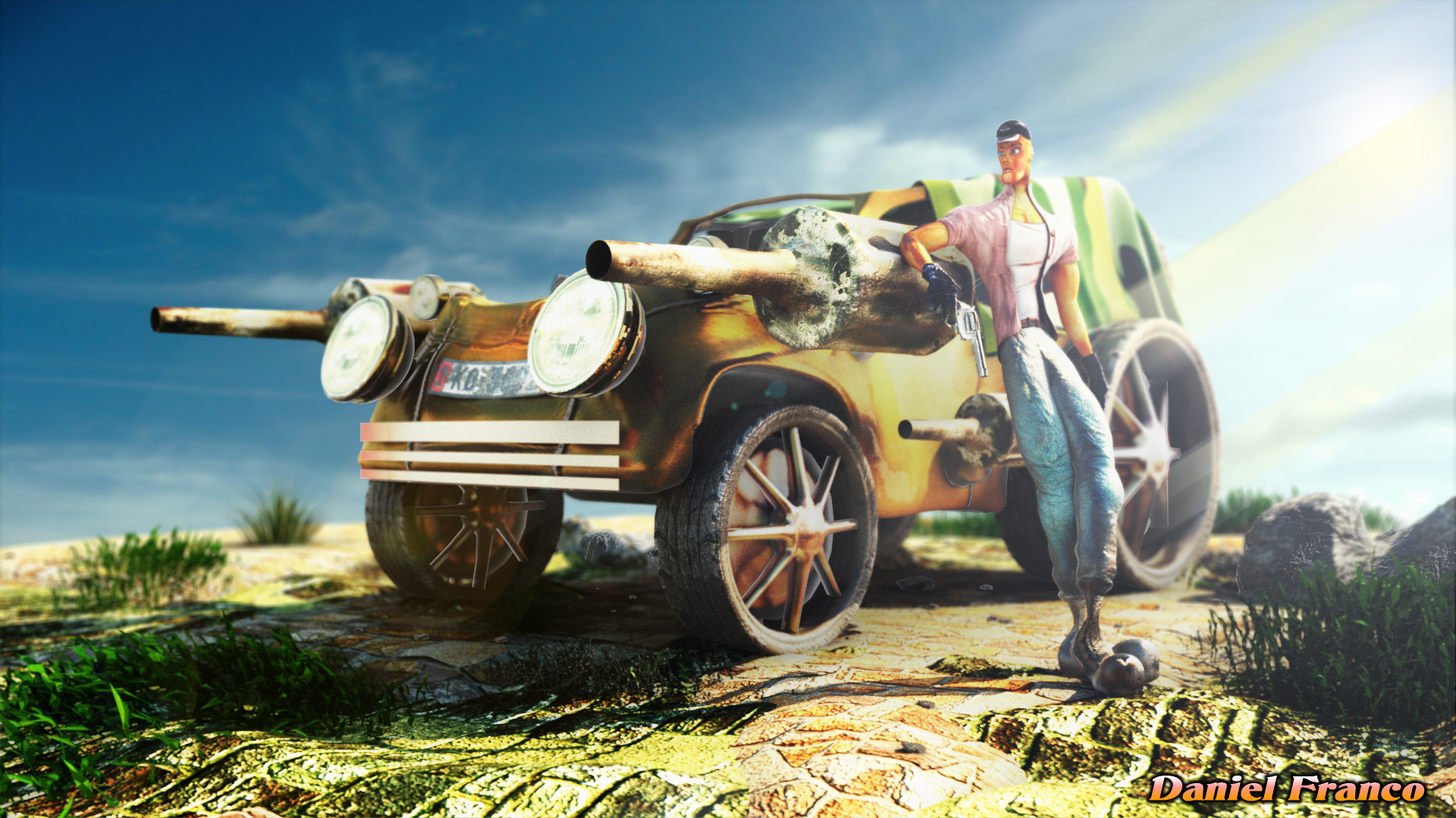 A nivel de modelo esta bueno, pero creo que la parte derecha de la imagen está un poco velada, tiene una sobre-exposición que le quita naturalidad. El texturizado si está en debe: lo siento demasiado plano, y los cañones necesitan urgente un UVW porque la parte del frente está demasiado corrida y se ve feo, las ruedas podrían estar más sucias, además que te ha quedo muy facetadas, ponle un smooth. Se ve raro la gorra del personaje, esta como parte de la texturam creo, mejor hubiera quedado modelada, y los faros no se ven bien, se nota que es una fotografía puesta flipeada y hay mucha diferencia con el resto del acabado.