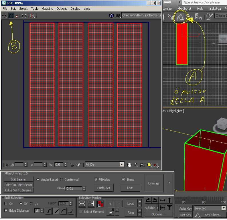 8.-(a) se pincha en angle Snap o en el teclado se presiona la letra a, (b) en edit UVWS se selecciona rotar o se presiona la letra e. Se debe rotar hasta que quede verticalmente.