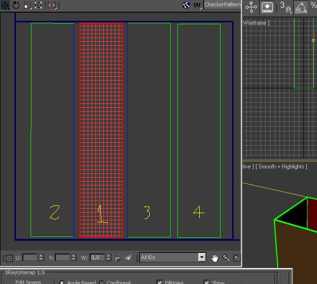5.-(1)seleccionar todos los polígonos(en vista perspectiva), (2)presionar botón edit, (3)en panel edit UVWS presionar (4) mapping y seleccionar Flatten mapping y presionar ok.