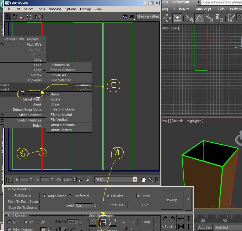 11.- (a) se selecciona modo edge, (b) seleccionamos los 2 Edges y presionamos botón derecho del mouse, (c) seleccionamos weld selected y listo, han quedado unidos, soldar los restantes.
