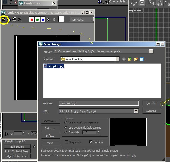 13.- (a) ahora ir a tools>render UVW template, (b) seleccionar tamaño de salida, si es para algo grande cómo en este caso le colocamos 1024*1024, para que al render la imagen no salga tan pixelada, sobre todo en tomas cercanas de cámara.